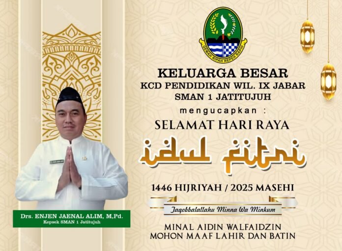 Majalengka, JURNALPOST.CLICK– Keluarga besar KCD Pendidikan Wil IX Jawa Barat, SMAN 1 Jatitujuh , Kabupaten Majalengka melalui Kepsek, Drs. Enjen Jaenal Alim, M.Pd., mengucapkan “Selamat Hari Raya Idul Fitri” 1446 Hijriyah.
