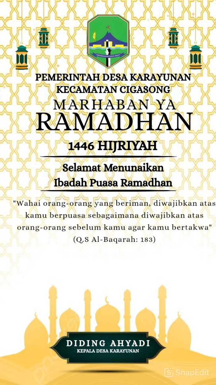 Majalengka, Jurnalpost.CLICK– Pemerintah Desa Karayunan, Kecamatan Cigasong, Kabupaten Majalengka melalui Kades, Diding Ahyadi mengucapkan “Selamat Menunaikan Ibadah Puasa1446 Hijriyah/2025”.
