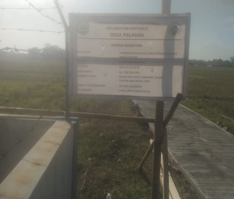 Pelaksanaan rabat beton jalan lingkungan itu berlokasi di dusun Desa Palasah dengan waktu pelaksanaan 30 hari kalender.