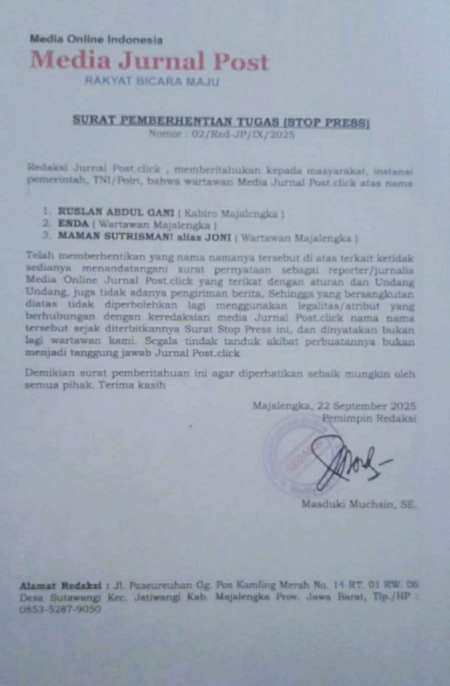Diberitahukan kepada seluruh Instansi Pemerintah, Dinas, Badan, Legislatif, Swasta, TNI serta Polri dan sebagainya, bahwa Wartawan tersebut bukan wartawan Jurnalpost.Click lagi, dan semua tindak tanduknya bukan lagi menjadi tanggungjawab redaksi.