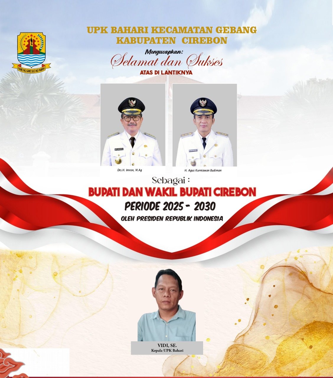 Cirebon, JURNALPOST.CLICK– Kepala UPK Bahari, Kecamatan Gebang mengucapkan “Selamat atas Dilantiknya Drs. H. Imron, M.Ag dan H. Agus Kurniawan Budiman sebagai Bupati dan Wakil Bupati Cirebon periode 2025-2030”. oleh Presiden Indonesia.