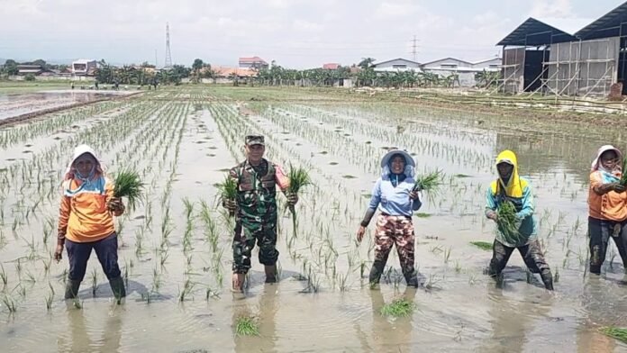 Babinsa bersama para petani melakukan penanaman padi secara gotong-royong, dengan harapan hasil pertanian yang optimal dapat tercapai, serta mendukung upaya pemerintah dalam mewujudkan swasembada pangan.